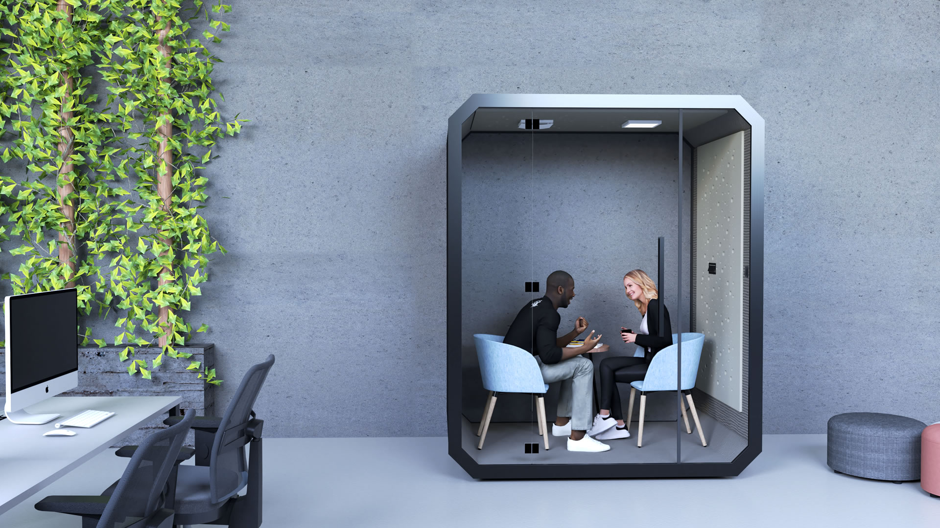 Projetada para receber até 4 pessoas, a Cabine QUATTRO viabiliza a composição de espaços confortáveis, flexíveis e criativos. Com mobiliário e infraestrutura específicos, se transforma em ambientes privativos em “open plan offices”, aeroportos, indústrias. centros de convenções e exposições, ou outro ambiente onde a privacidade acústica é necessária.